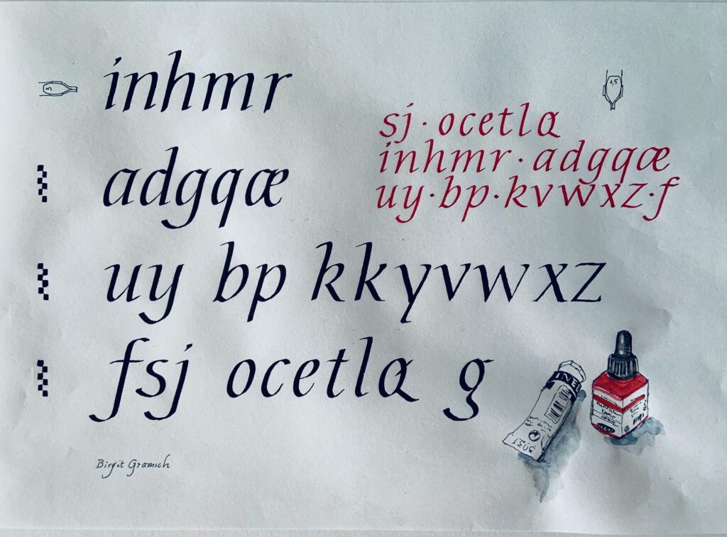 Die­se Schrift ist von mir ent­wi­ckelt und haupt­säch­lich für die Band­zug­fe­der gedacht. Sie ist nicht schwie­rig zu erler­nen. Die gute Les­bar­keit erlaubt die Anwen­dung für Sprü­che, Kar­ten oder Beschrif­tun­gen. Dazu bie­tet sie sich auch bes­tens an für Expe­ri­men­te jeg­li­cher Art: das Spie­len mit den For­men ermög­licht Gestal­tungs­ele­men­te und moder­ne Schrift­bil­der. Am Ende wird etwas Schö­nes ent­ste­hen. Was es ist, bleibt eine Überraschung!