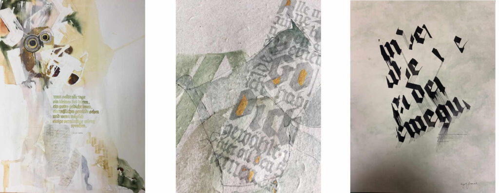 Schritt für Schritt wer­den wir Blät­ter in ver­schie­de­nen Tech­ni­ken gestal­ten, da und dort Wor­te und Sät­ze hin­zu­fü­gen, Buch­sta­ben als Gestal­tungs­ele­ment ver­wen­den, uns auf Neu­es ein­las­sen, zeich­nen, drucken .…..