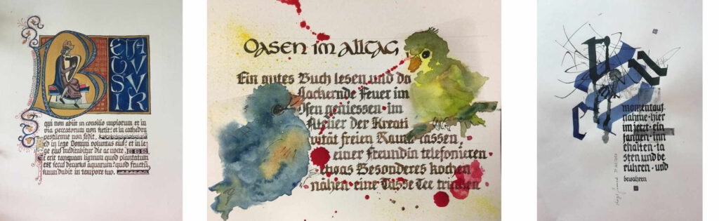 Die­ser Kurs rich­tet sich an alle, die schon min­des­tens eine kal­li­gra­fi­sche Schrift beherr­schen. Wir wer­den uns dem Herbst wid­men und ihm For­men, Spu­ren und Far­ben ent­zau­bern. Ein Herbst­ge­dicht wird uns inspi­rie­ren und zu Wort­spie­le­rei­en einladen.