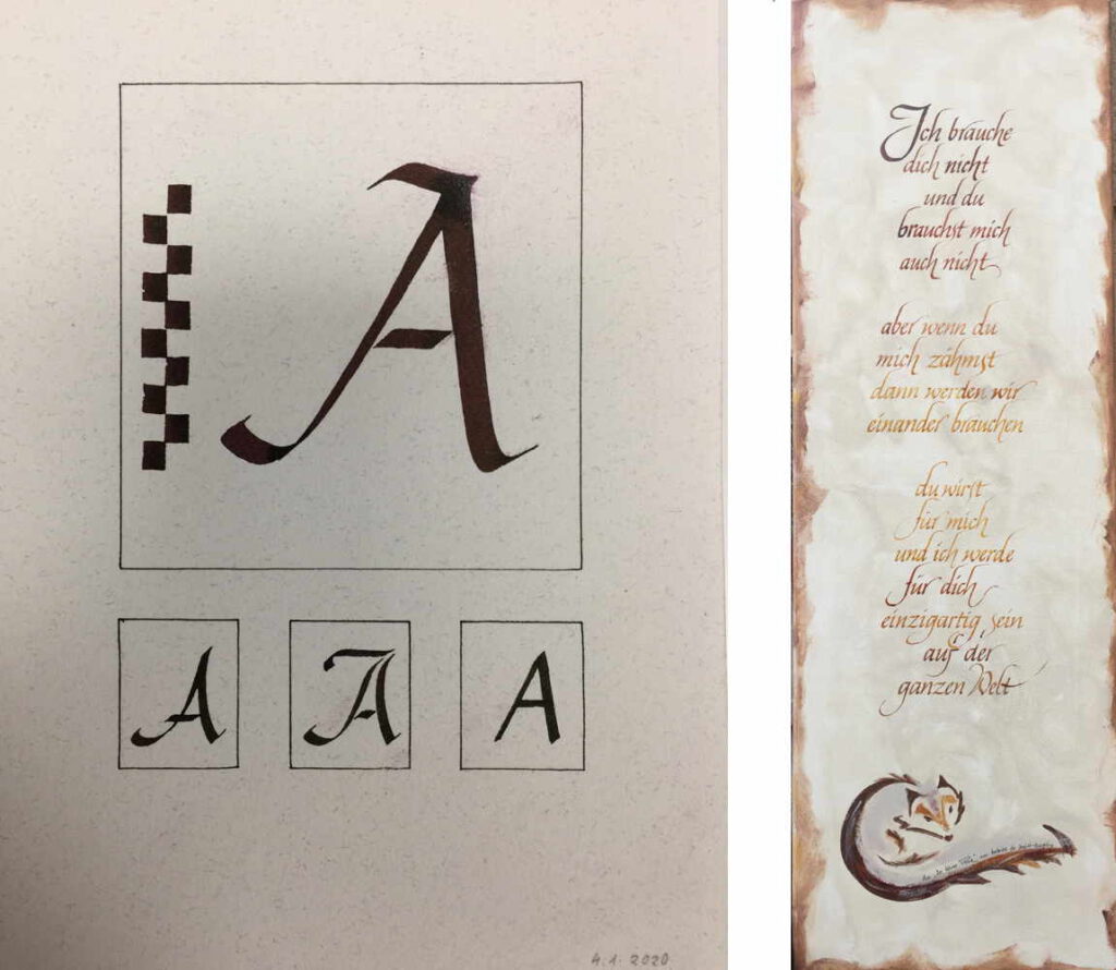• Übungs­pa­pier (Fabria­no 1264 Skiz­zen­block 90g oder Lana Esquis­se Skiz­zen­block 96g, jeweils Block in A4 oder A3), Block A4 oder A3 Clai­re­fon­taine Paint On Lis­se oder Rho­dia Touch Kal­li­gra­fie­block (nicht nötig, wenn ein Mate­ri­al­pa­ket bestellt wird)