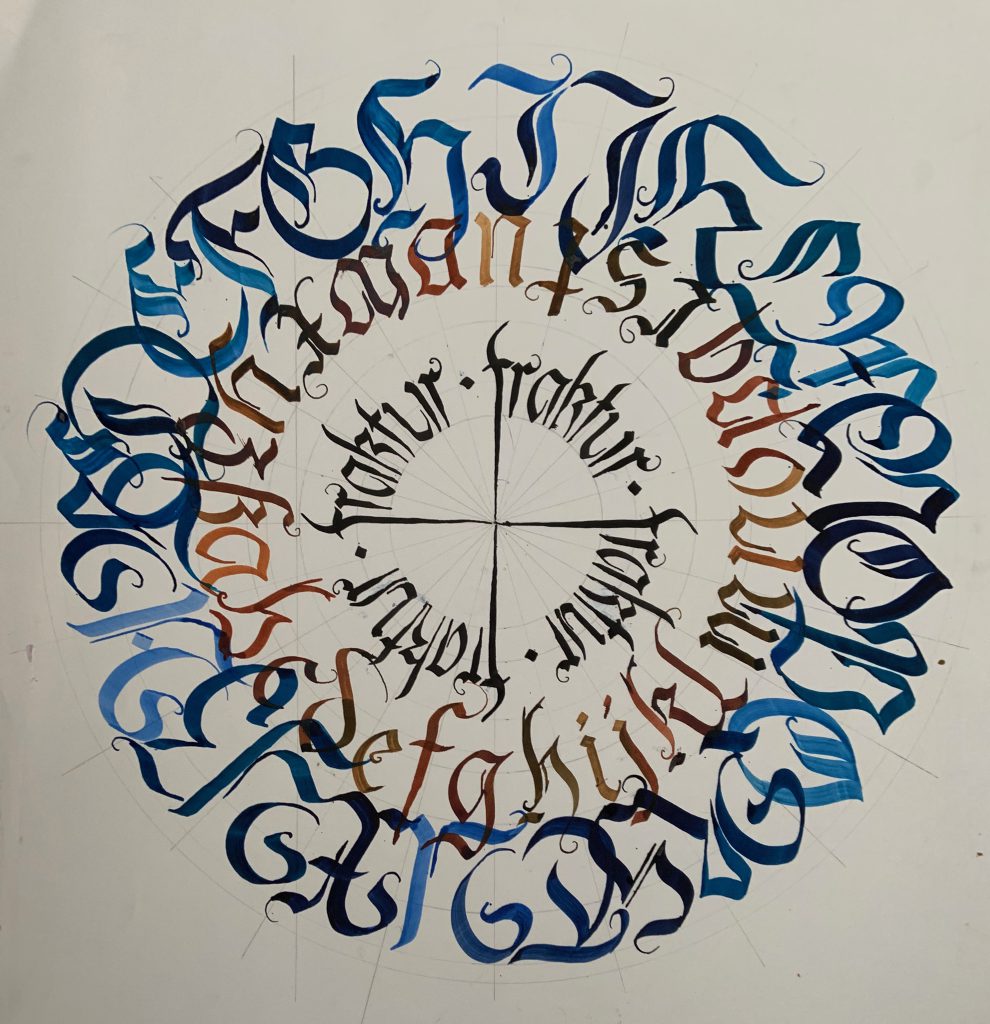 In die­sem Kurs erler­nen wir die Frak­tur, eine Band­zug­schrift, die zu den gebro­che­nen Schrif­ten zählt. Sie war die meist­be­nutz­te Druck­schrift von Mit­te 16. JHD – Anfang 20. JHD. Die gera­den Lini­en wer­den auf­ge­lo­ckert durch Schwün­ge, haupt­säch­lich in den Großbuchstaben.
