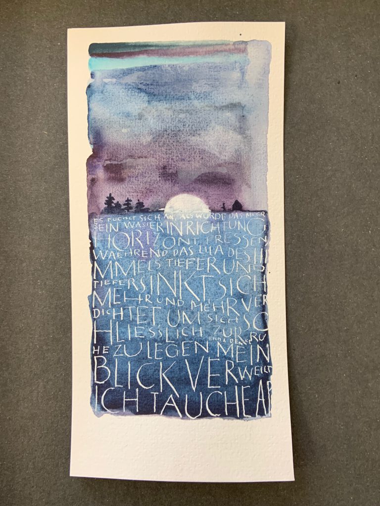 Die­se Schrift wur­de von Sig­rid Art­mann ent­wi­ckelt und haupt­säch­lich für die Band­zug­fe­der gedacht. Sie ist nicht schwie­rig zu erler­nen. Die gute Les­bar­keit erlaubt die Anwen­dung für Sprü­che, Kar­ten oder Beschrif­tun­gen. Dazu bie­tet sie sich auch bes­tens an für Expe­ri­men­te jeg­li­cher Art: das Spie­len mit den For­men ermög­licht Gestal­tungs­ele­men­te und moder­ne Schrift­bil­der. Das wer­den wir aus­pro­bie­ren! Am Frei­tag wer­den wir die Schrift üben und am Sams­tag mit ihr expe­ri­men­tie­ren. Ist auch für Anfän­ger geeignet!