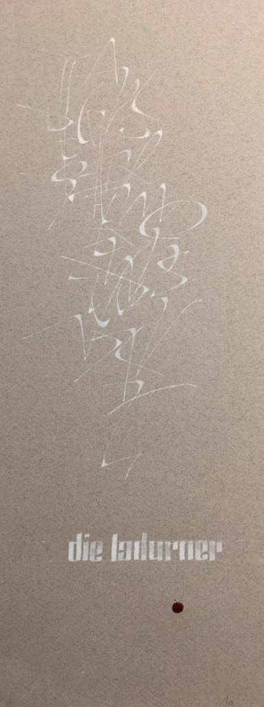 Mit die­ser Schrift hat Hel­ga Lad­ur­ner (Gestor­ben 2011) vie­le Kunst­wer­ke erstellt. Die­se Schrift hat kei­nen Namen erhal­ten, wird aber meis­tens als die „Lad­ur­ner-Schrift“ unter­rich­tet. Es ist eine schwung­vol­le Schrift, die nicht unbe­dingt für les­ba­re Tex­te ver­wen­det wird. Die Buch­sta­ben wir­ken zau­ber­haft als Schrift­bil­der und wer­den mit der Band­zug­fe­der geschrieben.
